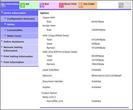 Muestra información diversa acerca del sistema, como el nombre de los componentes y el estado de las distintas bandejas de papel.