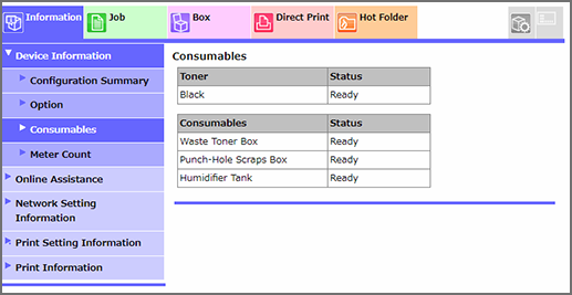 Puede confirmar el estado del tóner o las grapas, p. ej.
