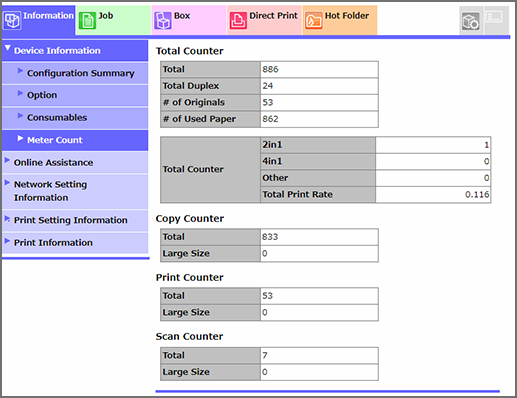 [Contador de copias] | Muestra el número total de páginas del original copiadas. Este elemento se muestra si el producto dispone de escáner. |