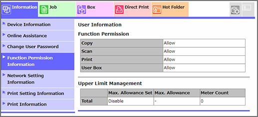 Permite visualizar la información de restricción de funciones del usuario registrado que inicia sesión.