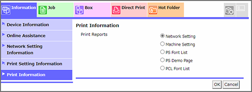 Imprime la configuración de red, la configuración del estado de la máquina y la lista de fuentes PS.