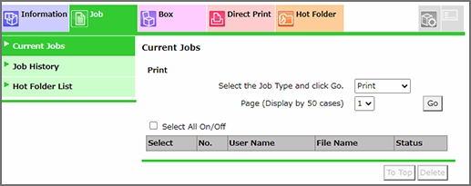 [Seleccione el tipo de trabajo y haga clic en Ir.] | Selecciona el tipo de tarea visualizada de la lista del menú. Es posible seleccionar el deseado entre estas opciones.