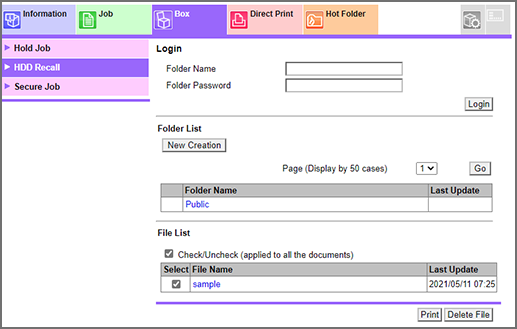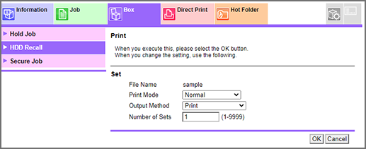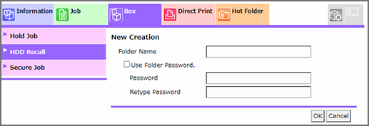 Puede confirmar, imprimir o eliminar una tarea almacenada en HDD o crear una carpeta o carpeta de usuario.