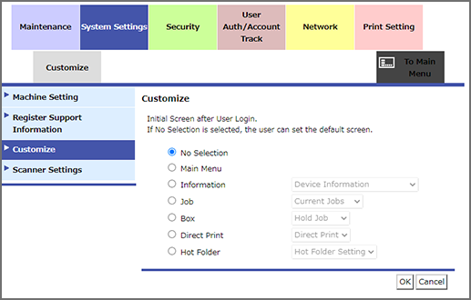 Permite definir la pantalla predeterminada que se muestra después de iniciar sesión en el modo de usuario.