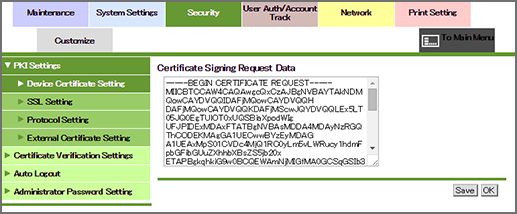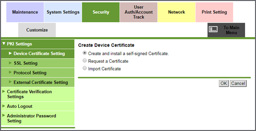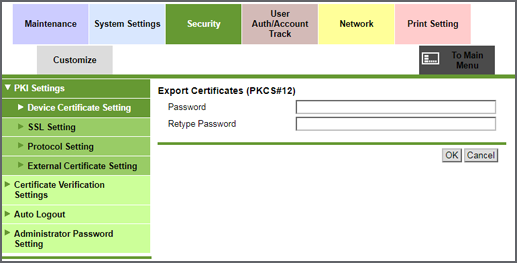 [Organización] y [Unidad de organización]: se pueden definir utilizando un máximo de 63 caracteres de un byte. [Localidad] y [Estado/Provincia] pueden especificarse usando un máximo de 127 caracteres. Para [País], defina el código de país indicado en ISO3166 con 2 caracteres de un byte.