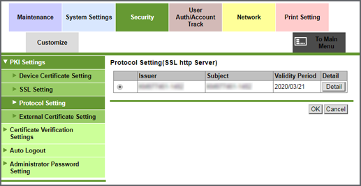 Haga clic en [Eliminar] en el protocolo para cancelar la asignación del certificado.