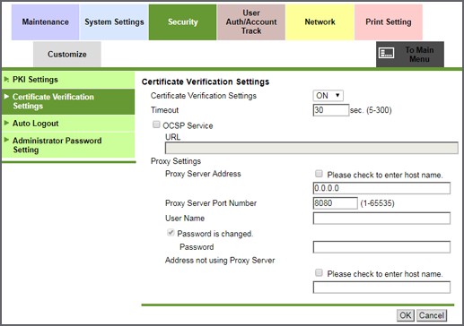 [Configuración de la verificación de certificados] | [ACTIV.] | Verifica el certificado. |