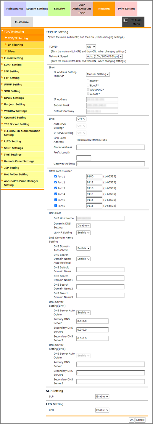 [IPv6] | Permite definir la dirección IPv6 según el entorno IPv6 que se utiliza. | |