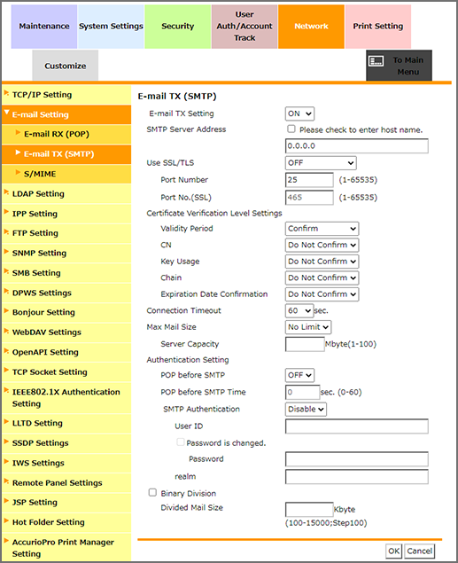 [Capacidad del servidor] | Define el tamaño máximo del correo electrónico disponible para el servidor SMTP. Rango: de 0 Mbyte a 100 Mbyte | |
