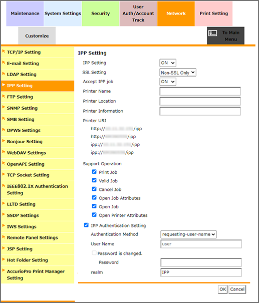 [Sistema de Autenticación IPP] | Utiliza autenticación IPP. Seleccione esta casilla de verificación para configurar el [Método de autenticación]. | |