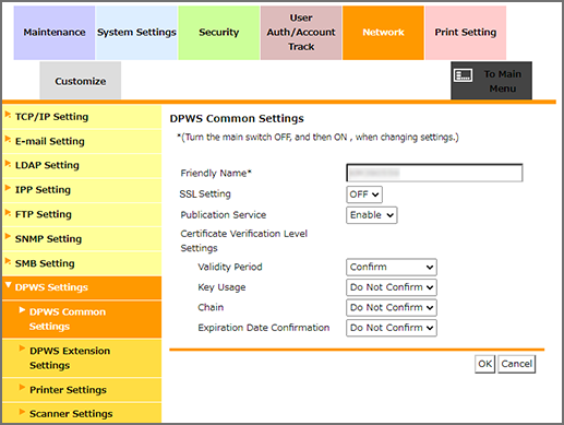 [Cadena] | [Confirmar] | Se comprueba si hay algún problema en la cadena del certificado (ruta del certificado). Para confirmar la cadena, consulte el certificado externo gestionado en el sistema. |