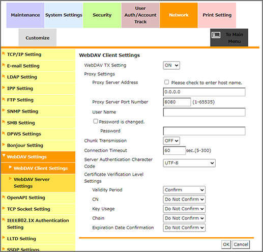 [Nombre de usuario] | Define el nombre de usuario del servidor proxy que se comunica con este sistema cuando se realiza una transmisión WebDAV. Se pueden introducir hasta 63 caracteres de un byte. | |