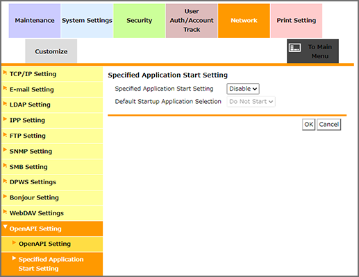 [Configuración inicio aplicación especificada] | [Activar] | Inicia solo la aplicación especificada al establecer una comunicación mediante Open API. |