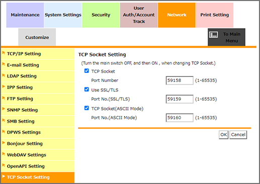 [TCP Socket (Modo ASCII)] | Utiliza el TCP Socket (ASCII Mode). Seleccione esta casilla de verificación para configurar el [Número de Puerto (Modo ASCII)]. |