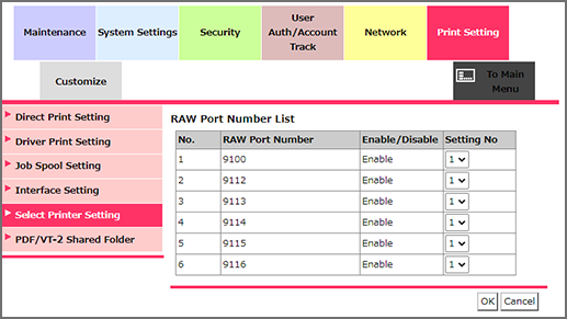 Permite asignar el número de configuración de impresora a cada puerto para la impresión directa.
