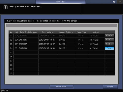 [Lista datos ajuste] | Muestra una lista de valores de ajuste registrados con [Ajuste auto.balance densidad]. |
