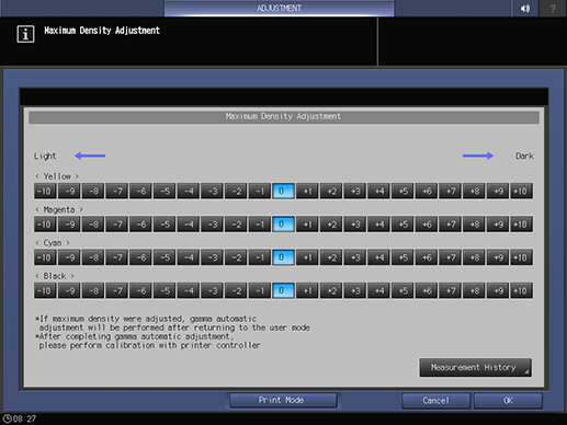 Teclas de selección de valor de ajuste | Después de medir la densidad máxima, seleccione el valor de ajuste según el [Resultado de medición densidad (aprox.)]. |
