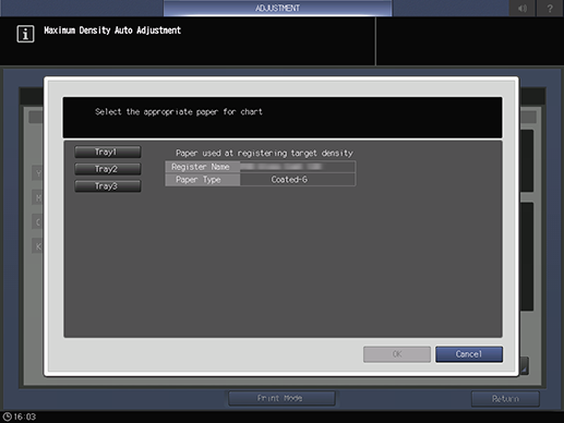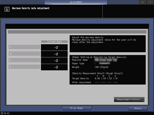 Esta función permite ajustar automáticamente la densidad máxima imprimiendo un gráfico. Esta función permite medir las diferencias entre los valores de densidad objetivo definidos por el Servicio de Asistencia Técnica (CE) y ajustar el valor de medición.