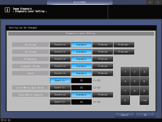 [Ruido punto color/blanco] | [Cantidad] | Ajuste el número de puntos blancos o de color que deben diagnosticarse. Utilice el teclado en pantalla para introducir el valor numérico. Rango: de 2 a 10 |