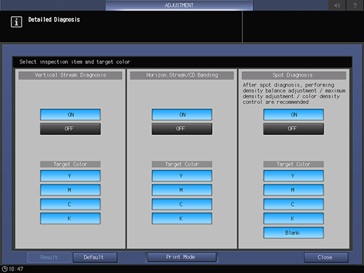 [Predeterminado] | [Activado] y [Color de destino] se seleccionan para cada opción de diagnóstico. |