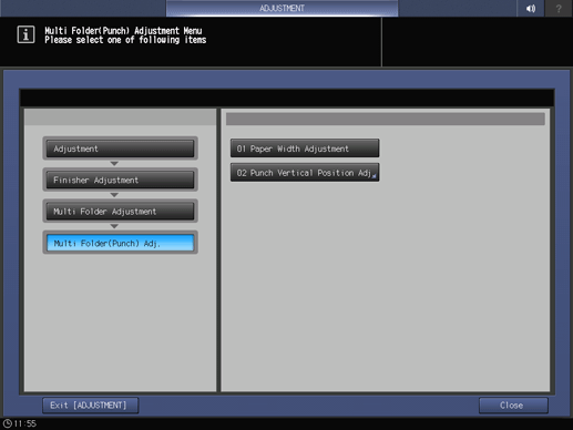 Panel táctil - [UN.PRINC.] - [Ajuste] - [Ajuste unidad de acabado] - [Ajuste plegadora múltiple] - [Aj. carpeta múlt. (perf.)]