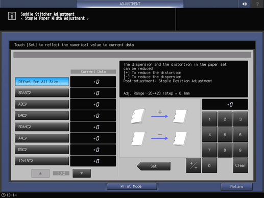 Ajuste > [Ajuste de SD] (Unidad de grapado en el lomo SD-513) > [Aj. ancho papel grapado]