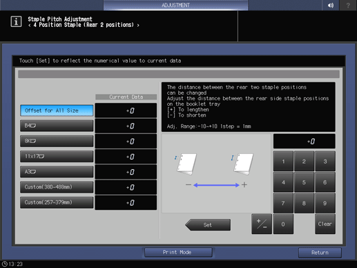 Ajuste > [Ajuste de SD] (Unidad de grapado en el lomo SD-513) > [Ajuste espaciado grapas] > [Grapa 4 pos.(2 pos.tras.)]