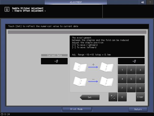 Ajuste > [Ajuste de SD] (Unidad de grapado en el lomo SD-513) > [Ajuste desplazamiento grapa]
