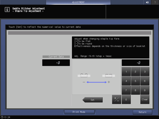 Ajuste > [Ajuste de SD] (Unidad de grapado en el lomo SD-513) > [Ajuste de punta de grapa]
