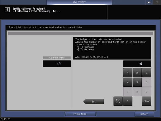 Ajuste > [Ajuste de SD] (Unidad de grapado en el lomo SD-513) > [Aj.(frec.) aplanado pliegue]
