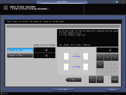 Ajuste > [Ajuste de SD] (Unidad de grapado en el lomo SD-513) > [Aj. acabado de corte lateral]
