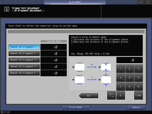 Utilice [+ / -] para seleccionar el signo positivo o negativo del valor numérico. Para cambiar [Datos actuales], pulse [Definir].