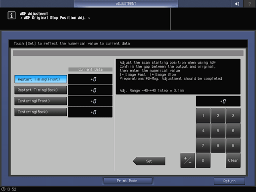 - Para ajustar la posición de inicio de escaneado: ejecute [Aj.ampl.dir.alimentación] en [Ajuste de ADF].