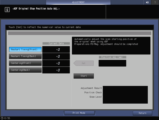 Si el ajuste falla, se muestra [NG] en [Resultado de ajuste]. Realice los ajustes con [Aj. pos. límite original ADF].