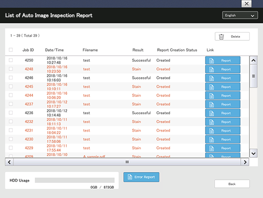 [Error Report] | Muestra la lista de informes de un error ocurrido durante la ejecución de la tarea. Un informe se emite como archivo PDF y se elimina automáticamente después de completar la tarea. Este elemento no se muestra si no hay errores. |