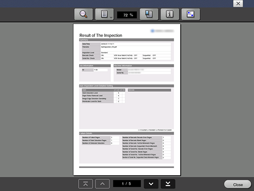 [Completed Job]: informe de impresiones que cumplen el nivel de inspección. No es posible ver ni guardar datos en el Panel táctil. Acceda a través de un navegador y compruebe el informe.