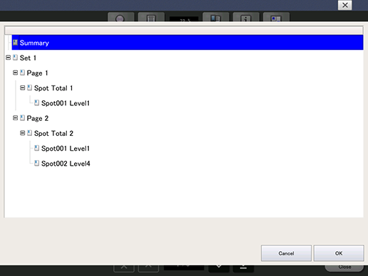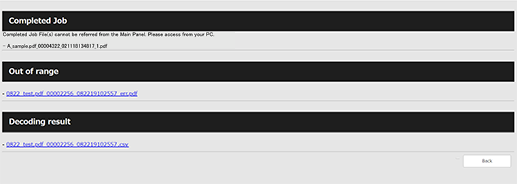 [Report] | Muestra la pantalla para consultar [Completed Job], [Out of range] o [Decoding result]. |