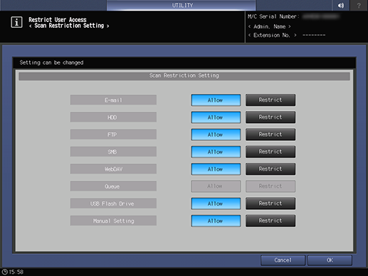 [Correo electrónico] | [Permitir]: Permitir enviar datos de escáner. [Prohibición]: Prohibir enviar datos de escáner. |