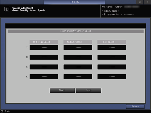 Una vez finalizado el ajuste, los valores de ajuste del amarillo, magenta, cian y negro se muestran individualmente.