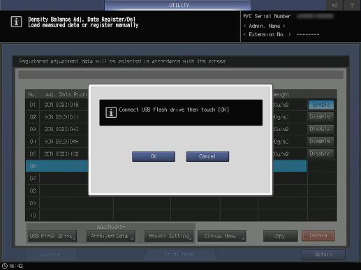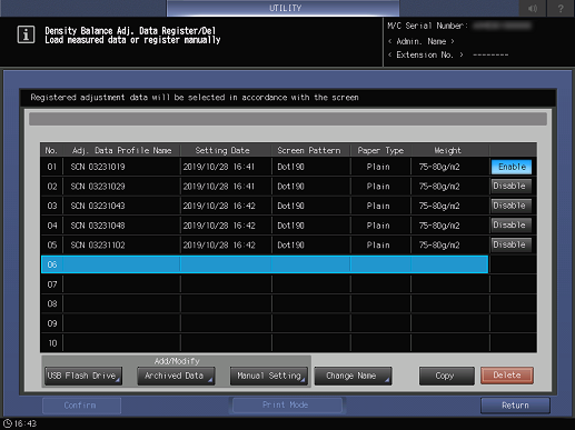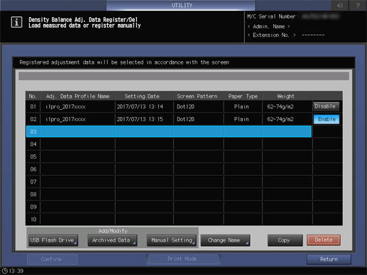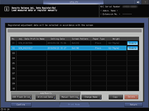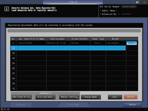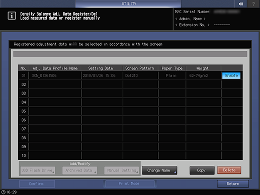[Config. manual] | Introduzca los valores de ajuste de balance de densidad manualmente y regístrelos como nuevos. Los datos existentes también se pueden corregir. |