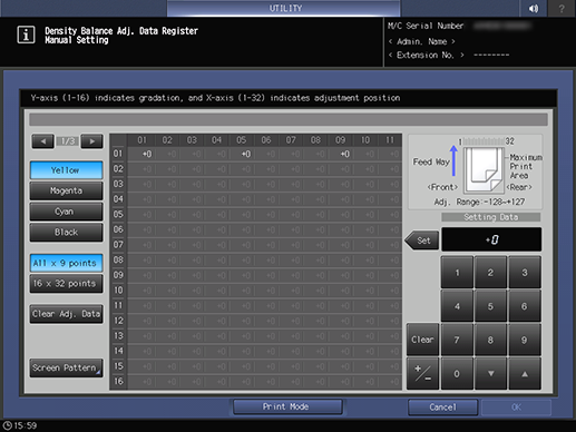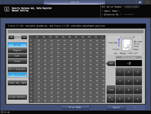 Modo [16 e 32 puntos]: escriba manualmente los valores de ajuste de densidad de 32 puntos en la dirección de cruce de la alimentación del papel y de 16 puntos en la dirección de alimentación del papel en un total de 512 puntos.