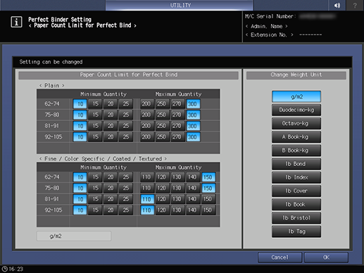 [Límite cont. papel para encuadernación] | Define el número mínimo y máximo de hojas que puede tener un encuadernado con el gramaje básico del papel utilizado para el bloque de texto y el tipo de papel utilizado para el bloque de texto. Cuando se combinan el peso base del papel y el tipo de papel utilizado, el número de hojas limitado es el siguiente.