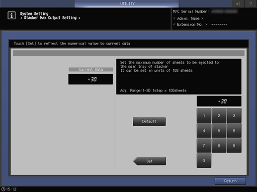[Definir] | Asigna el valor numérico definido utilizando el teclado en pantalla para [Datos actuales]. Rango: de 1 a 30 (en unidades de 100 hojas) |