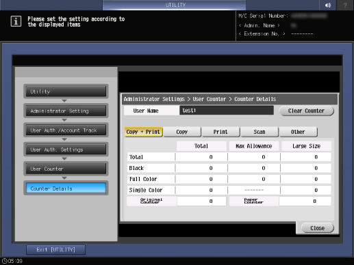 [Detalles de contador] | Permite visualizar el estado de uso de cada usuario registrado. Se puede revisar el número de contadores detallado y clasificado para cada elemento operativo y también se puede reiniciar el número de los contadores para cada elemento operativo. |