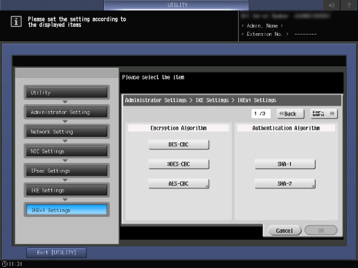 [Algoritmo de cifrado] | [DES-CBC] | Seleccione el algoritmo de cifrado utilizado para generar la clave genérica para la comunicación IPsec. Puede definir la longitud de clave* cuando está seleccionado [AES-CBC]. *: valor que indica el tamaño de los datos (clave de cifrado) que se utiliza en el cifrado y la descodificación |