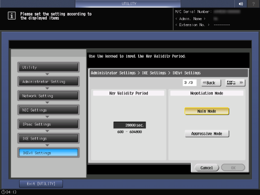[Período de validez de la clave] | Puede establecer el plazo de caducidad de la clave genérica utilizada en la comunicación IPsec. Una vez transcurrido el plazo de caducidad, se genera automáticamente una nueva clave que permite mantener la seguridad. Pulse Panel de control - C para permitir la entrada. Rango: 600 a 604800 seg. | |