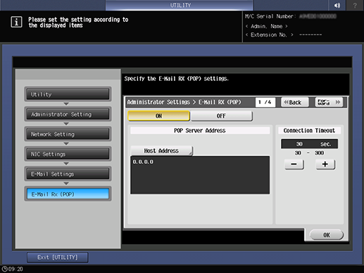 [Tiempo espera conex.] | Si transcurre el tiempo especificado sin que se realice ninguna operación mientras está conectado al servidor POP que se comunica con el sistema para la recepción de correos electrónicos, la conexión se interrumpirá. Pulse [-]/[+] para especificar el periodo de tiempo de espera. Se aumenta/reduce en incrementos de 30 segundos con cada pulsación. Rango: 30 a 300 seg. | |
