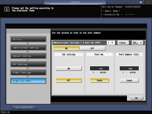 [Número de puerto (SSL)] | Permite definir el número de puerto para comunicación SSL a través del servidor POP. Pulse [Introducir] e introdúzcalo con el Teclado del Panel de control. Rango: de 1 a 65535 | |