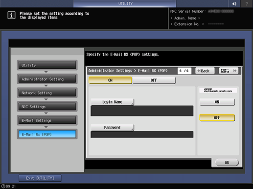 [Número puerto] | Ajusta el número de puerto del servidor POP. Pulse [Introducir] e introdúzcalo con el Teclado del Panel de control. Rango: de 1 a 65535 | |