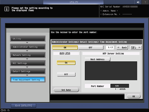 [Número puerto] | Se configura el número de puerto utilizado para la comunicación con el servidor NTP. Introduzca el número de puerto utilizando el Teclado del Panel de control. Rango: de 1 a 65535 | |